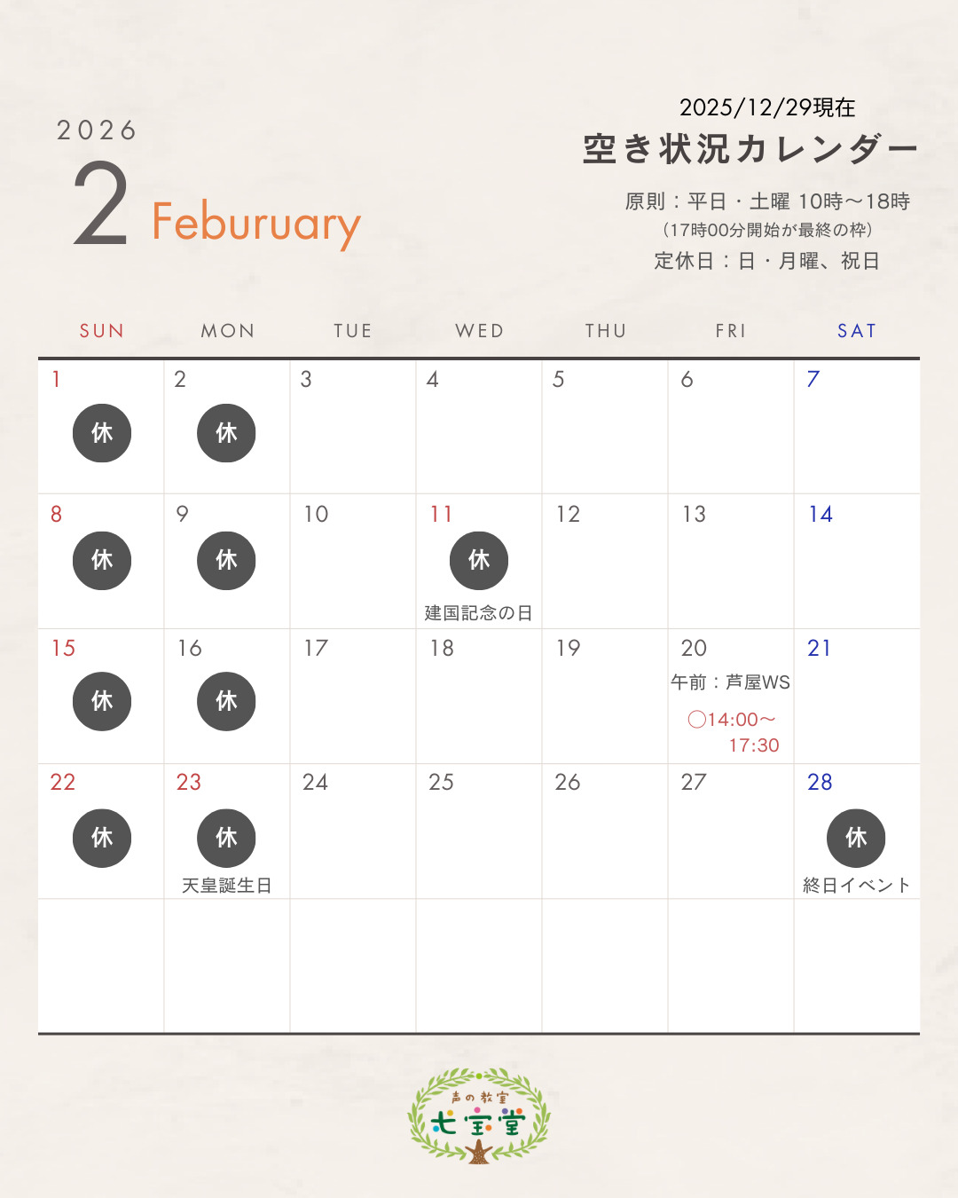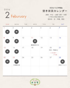 2026年より、定休日を日曜・祝日に加え、月曜もお休みにさせていただきます。