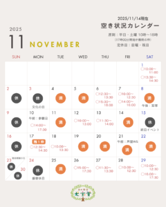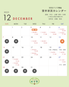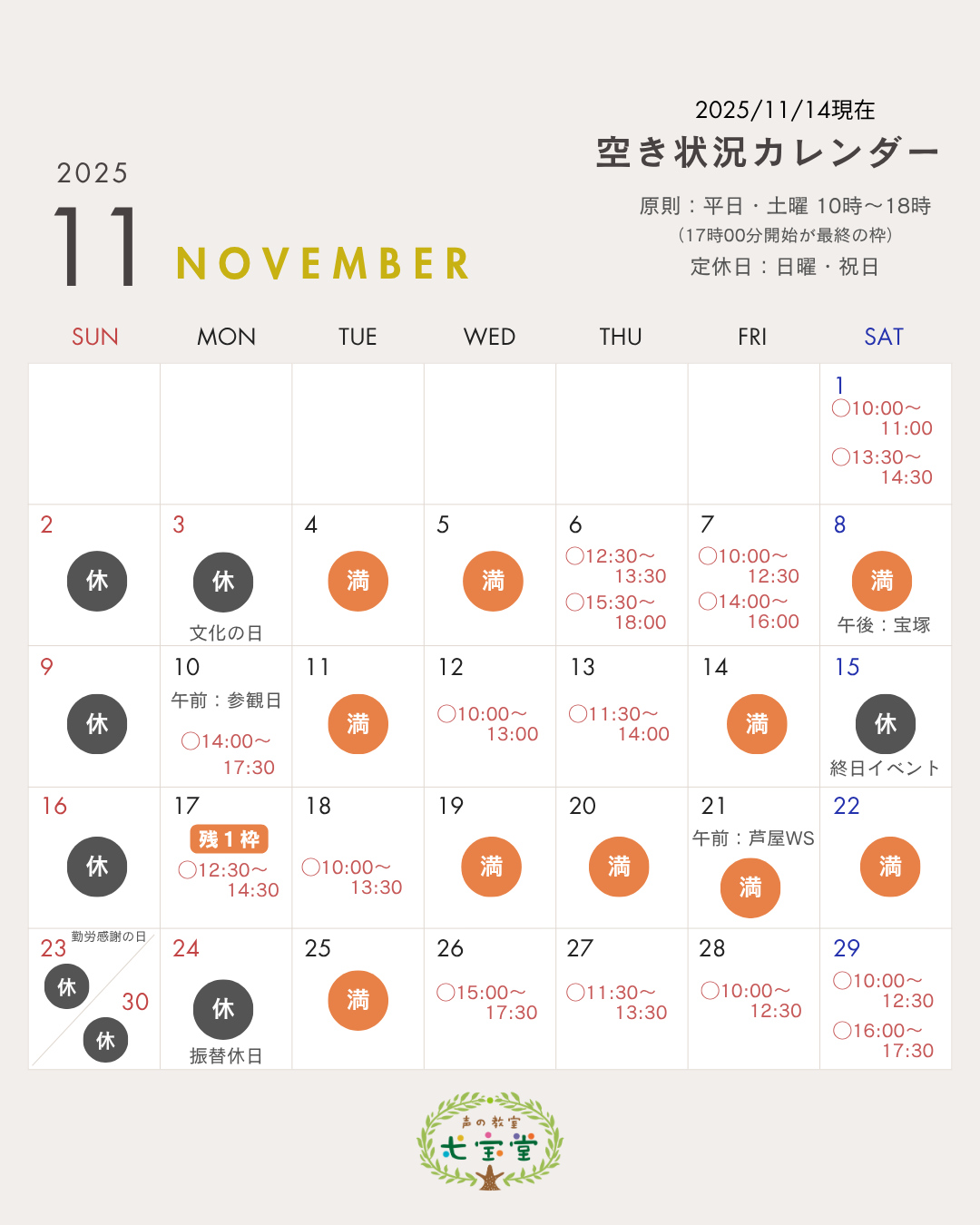 最近の空き状況 2025年10月16日 お知らせ 七宝堂 4〜5日おきに更新してます。 9月頃から、2週間先くらいまでは満席になることが多いです。 受けたい!と思われてる方はお早めにご予約くださいませ〜🙏